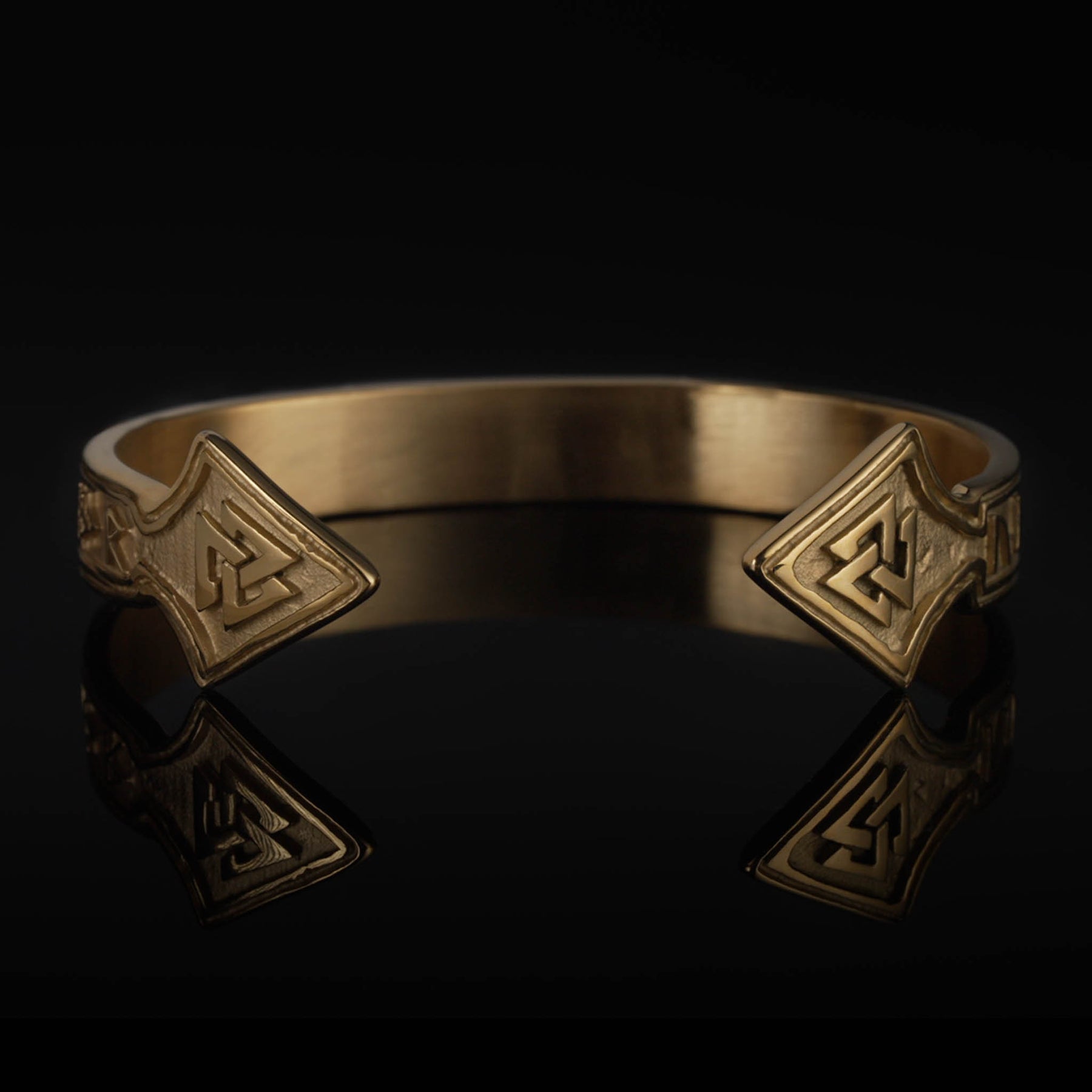 Cuff ending in the shapes of Gungnir, the spear of Odin, with Valknut symbols in the spear head. Written on it with the Younger Futhark is: "Oðin atriði sviðurr alföðr"which translates to: "Odin the Attacking rider, Wise One and Father of all". They are all different names used for Odin.
