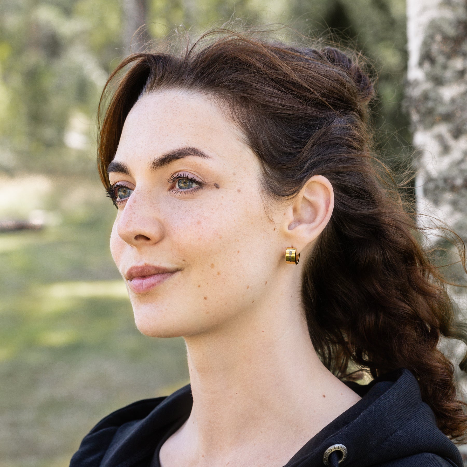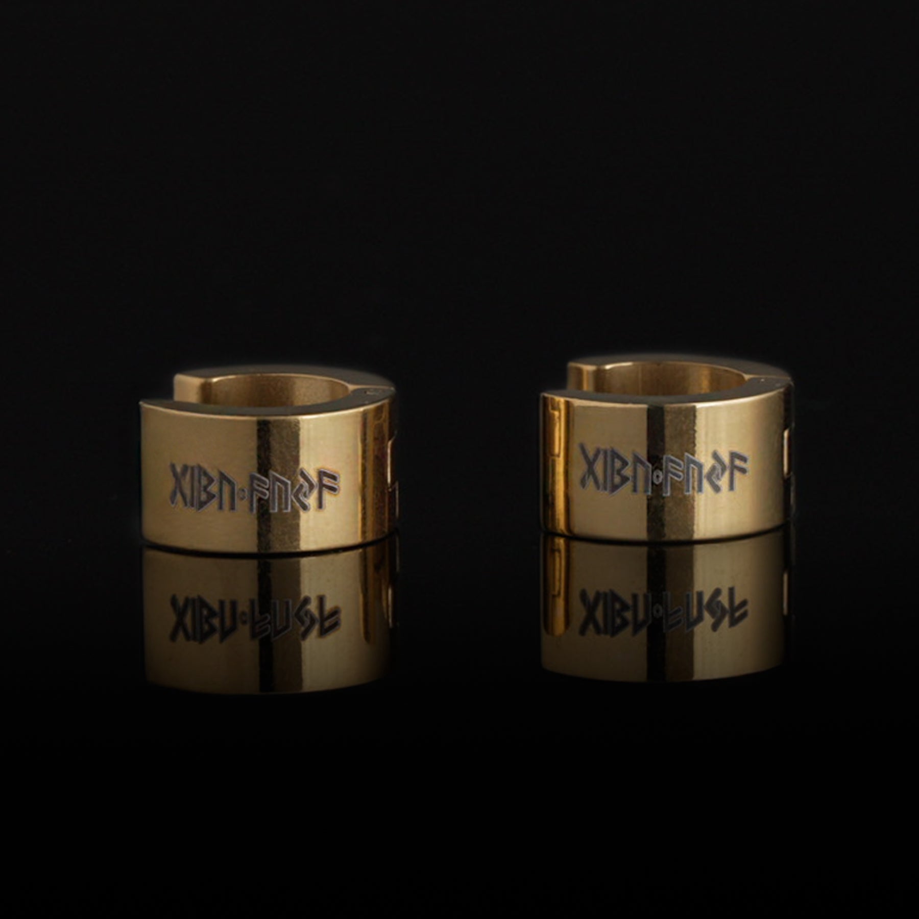 Huggie hoop earring with "Gibu Auja" written with the Elder Futhark runes. It is an old inscription found in archaeological finds from 6th Century Scandinavia that translates to "I Give Luck". Suitable for both men and women. Sold individually or as a pair.