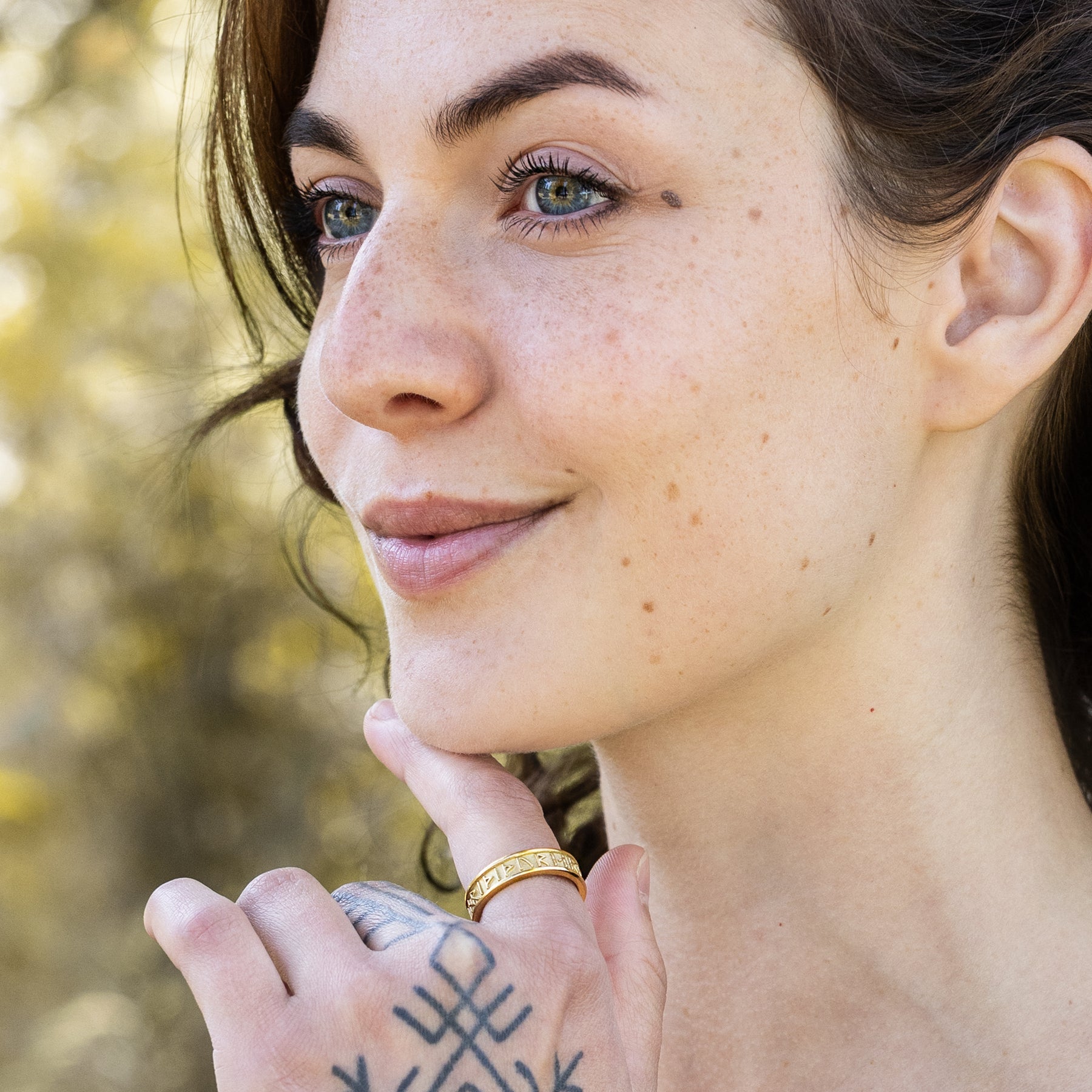 Beautiful Ring, written on it with the Younger Futhark is: "Þorr jarðar burr hlórriði einriði", which translates to: "Thor, Earth's son, the Thundering Storm, He who travels alone." They are all different names, kennings, used for Thor.