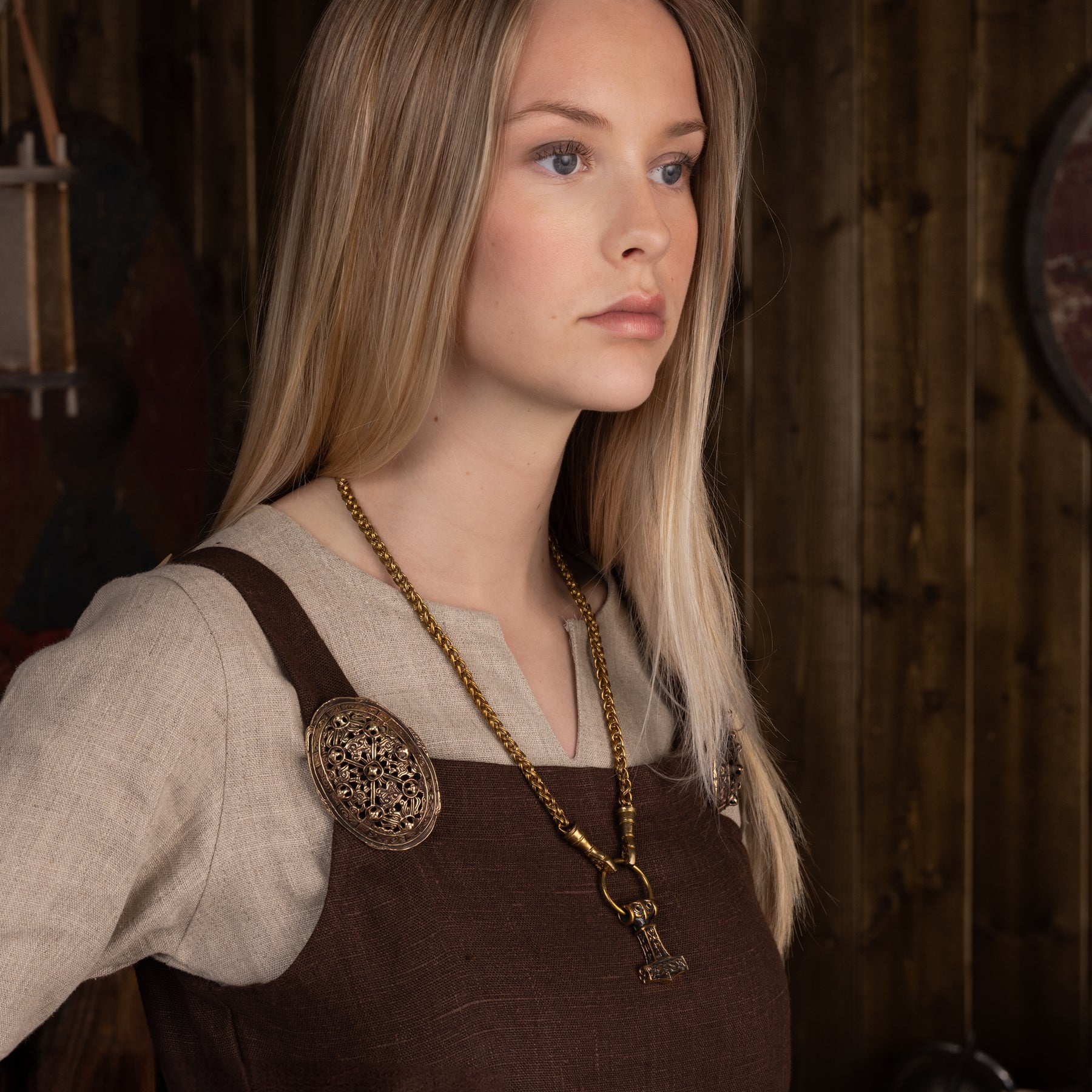 Norse women wore pairs of oval brooches to fasten the shoulder straps of a tunic worn over other garments. Beads of amber, wood or glass may have hung between these brooches or a chain with useful items such as a comb or keys. Nearly all finds of dress brooches are crafted from bronze.