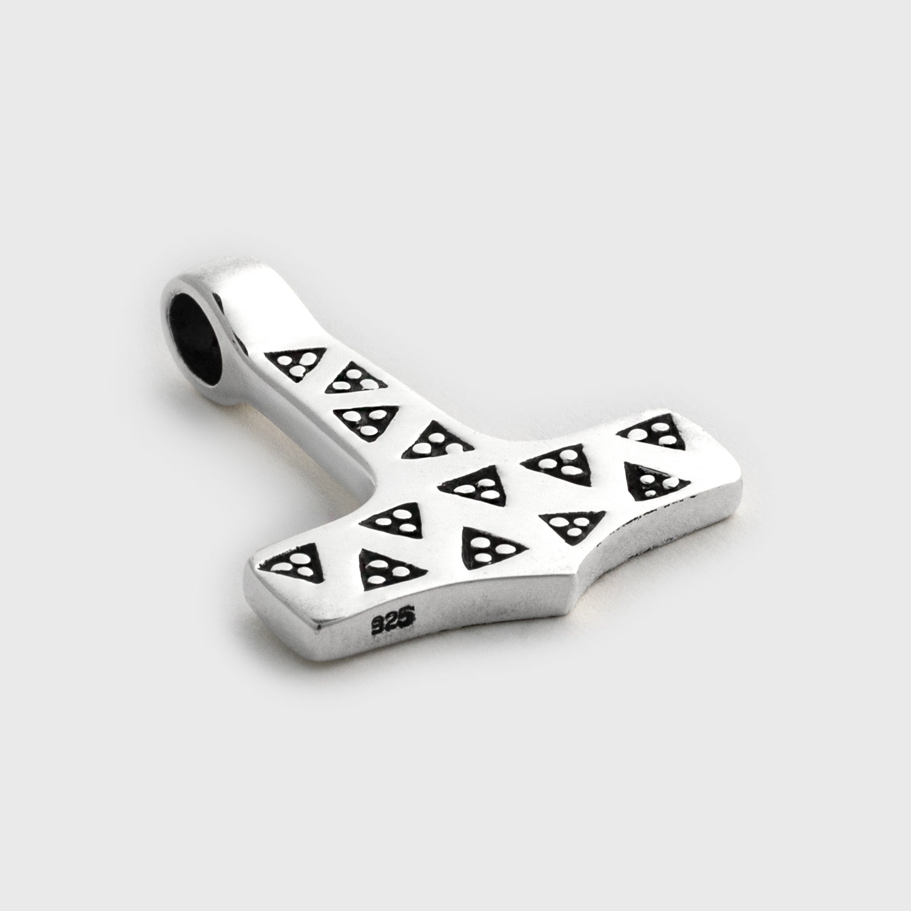 A reproduction of the Thor’s Hammer found in 1828 in the Moheda parish, in Småland, Sweden. The hammer was part of a larger treasure that was placed in a clay urn and buried. The original find is today located at the Småland County Museum in Växjö, Sweden. The original hammer was found with a ring. Stamping triangles was a common way of decorating jewelry during the Viking Age.