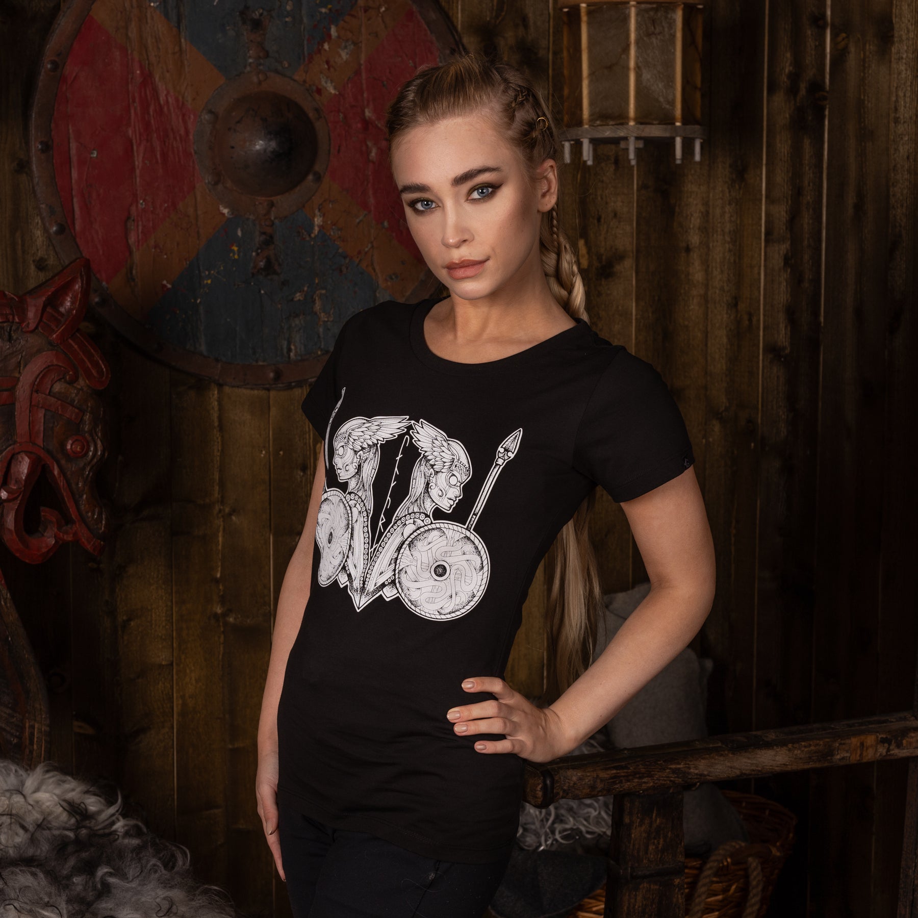 The shirt printed with two guarding Valkyries. A stave rune with "Valkyria" is positioned between them.