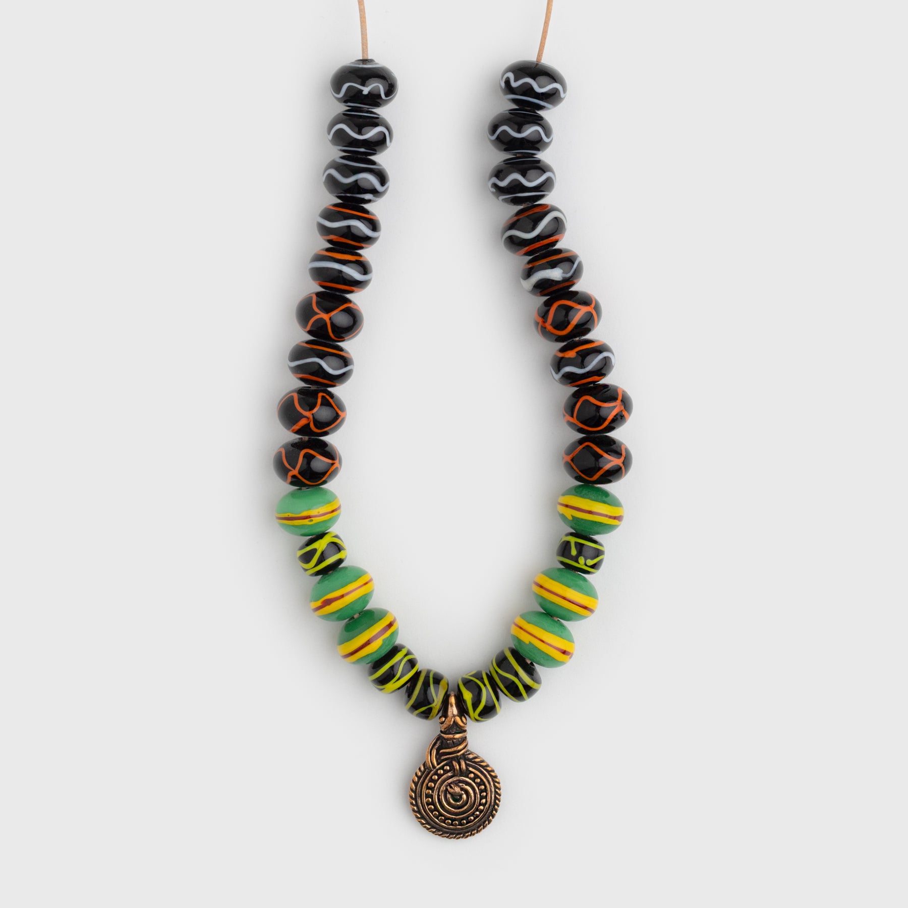 This bead set comes as a complete necklace with a handmade replica of the Nidhöggr pendant based on a find from Eketorp, Sweden, and 30 handmade Viking glass beads. The beads are replicas of finds from the Birka excavations and are shaped through the traditional winding technique, where molten glass is wrapped around a metal rod.