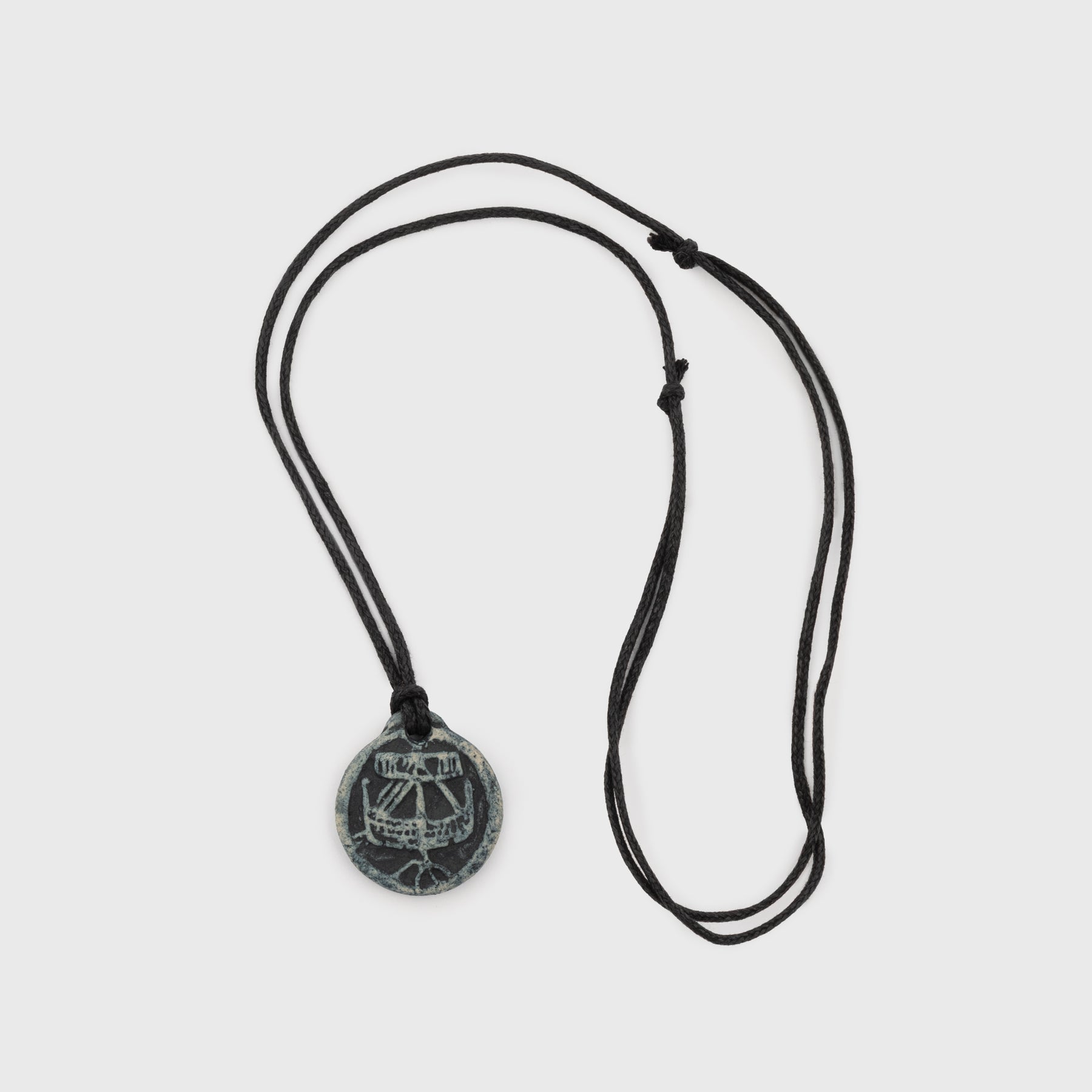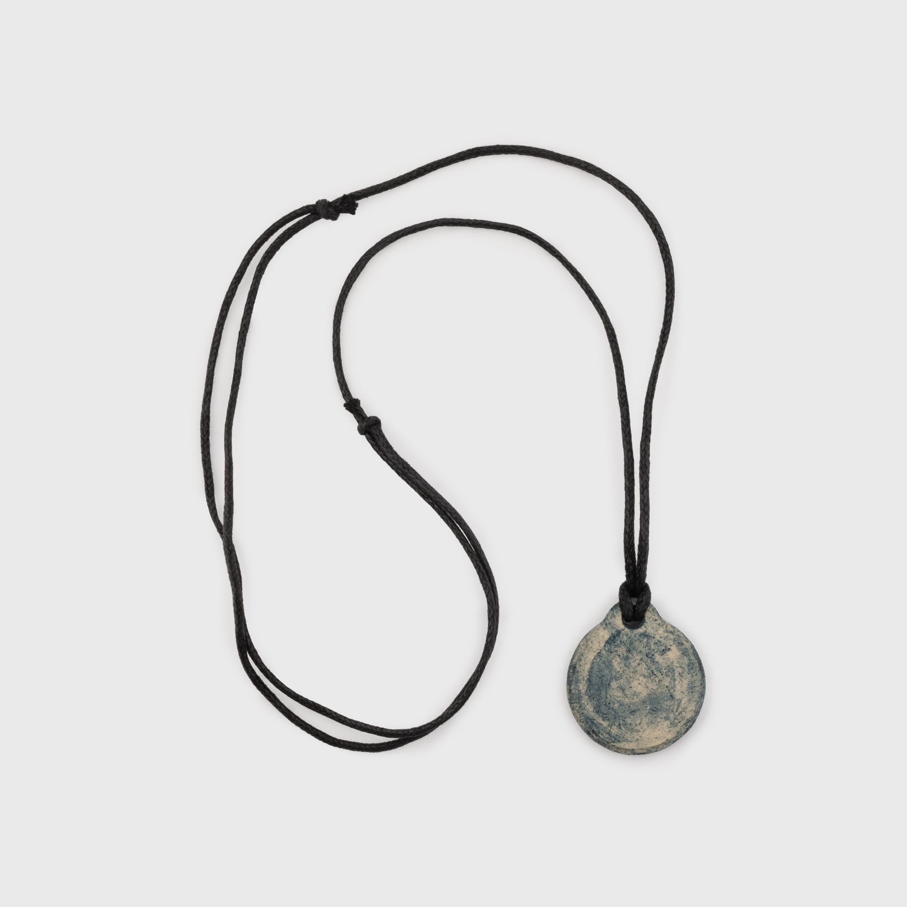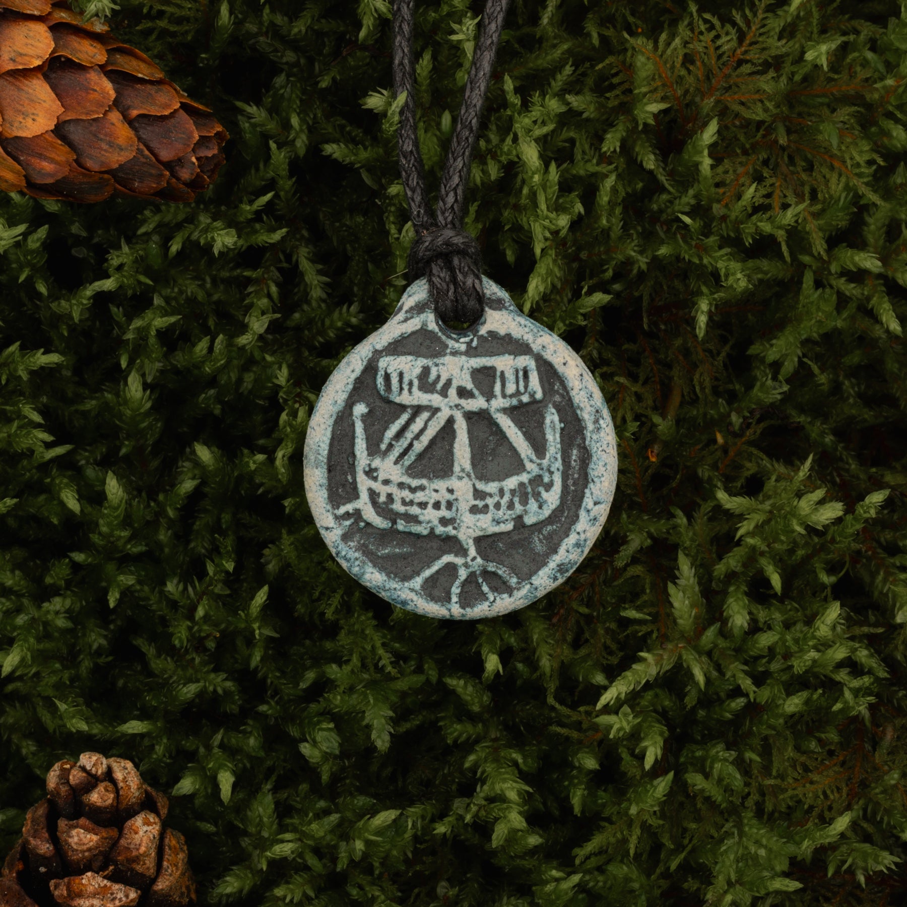 This pendant is a ceramic interpretation of a Viking Age silver coin, originally minted in Hedeby, a major trading center of the time. The original coin was discovered in Birka, reflecting the long-distance trade networks that connected settlements across the Baltic Sea. The ship motif symbolizes the central role of seafaring and the strong ties between the early towns of the Nordic region. Each pendant is individually crafted, giving it a unique color and texture. Comes with an adjustable cord.