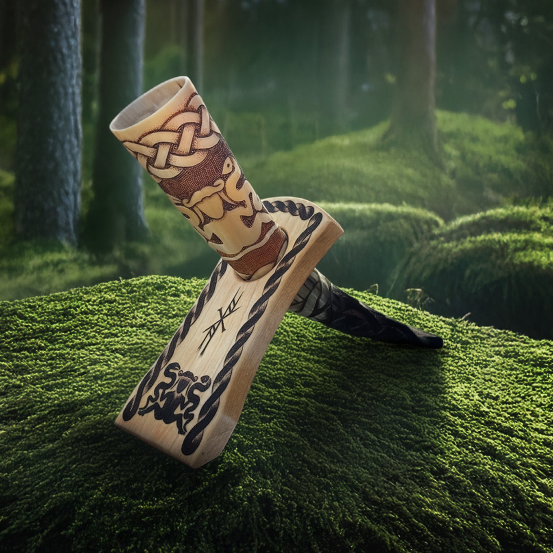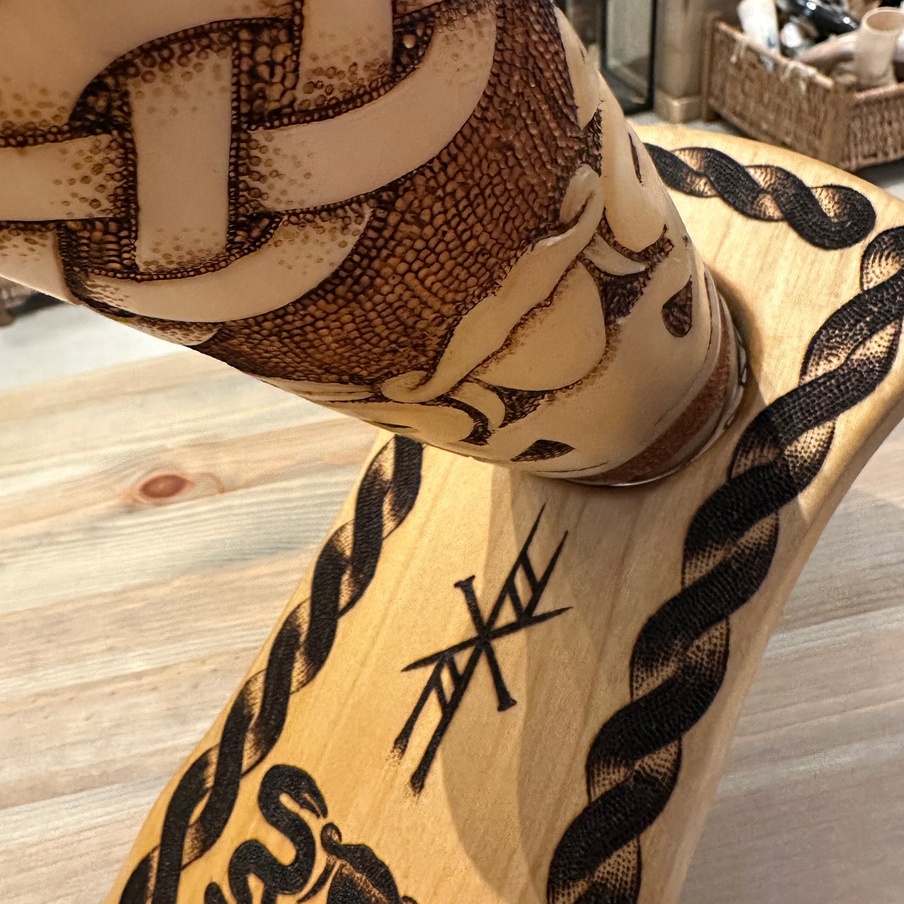 The wooden stand builds on the same design, with the shape mimicking the stone. The snakewitch is depicted on it, as well a bindrune of the runic galdir ᚺᚨᚷᚨᚺ ”HAGAH”. It's crafted out of birch and treated with linseed oil.