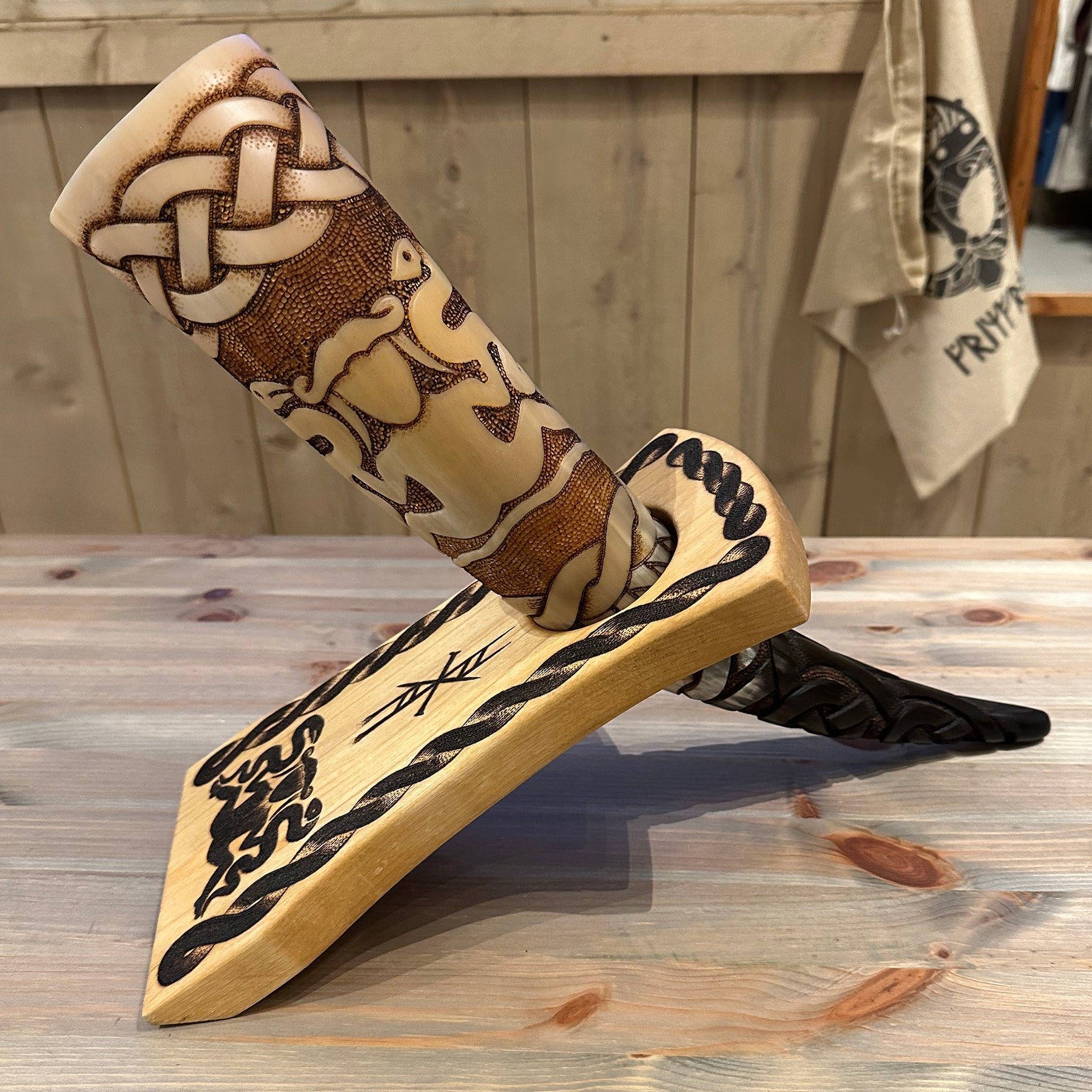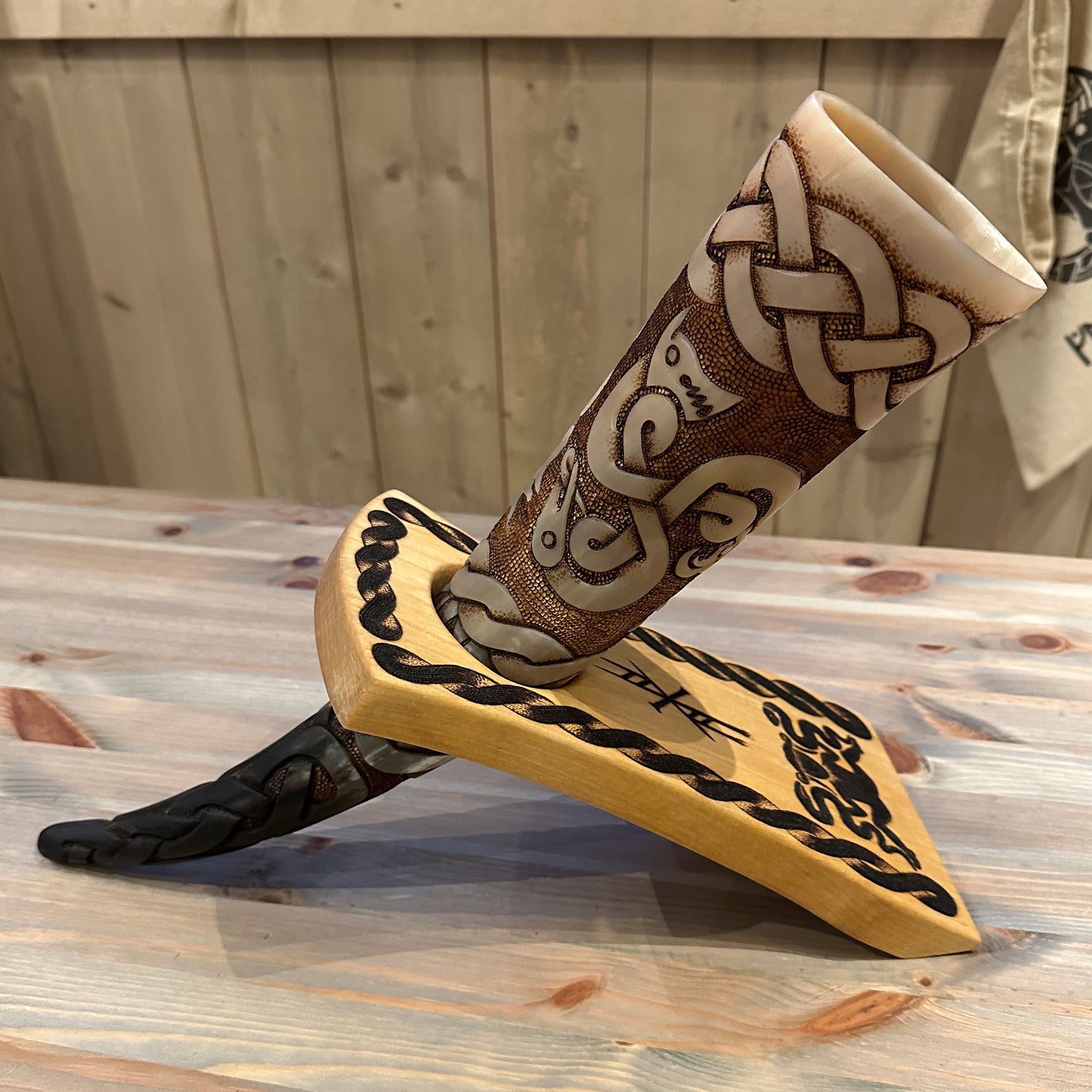 This 2 pint, very detailed horn has had a lot of work invested in it. It is inspired by the Picturestone in Gotland, Sweden, that has the original design. The artist's interpretation differs slightly from the most common one. He sees her as the "first witch", hence the runic writing "wurmawikko-hagatusi" in the Elder Futhark. The knotwork design matches the 600s and the style of the Picture Stone. The animals in the triangular triskele have been changed to a wolf, raven and snake, which fits better with the artists interpretation of the motif.