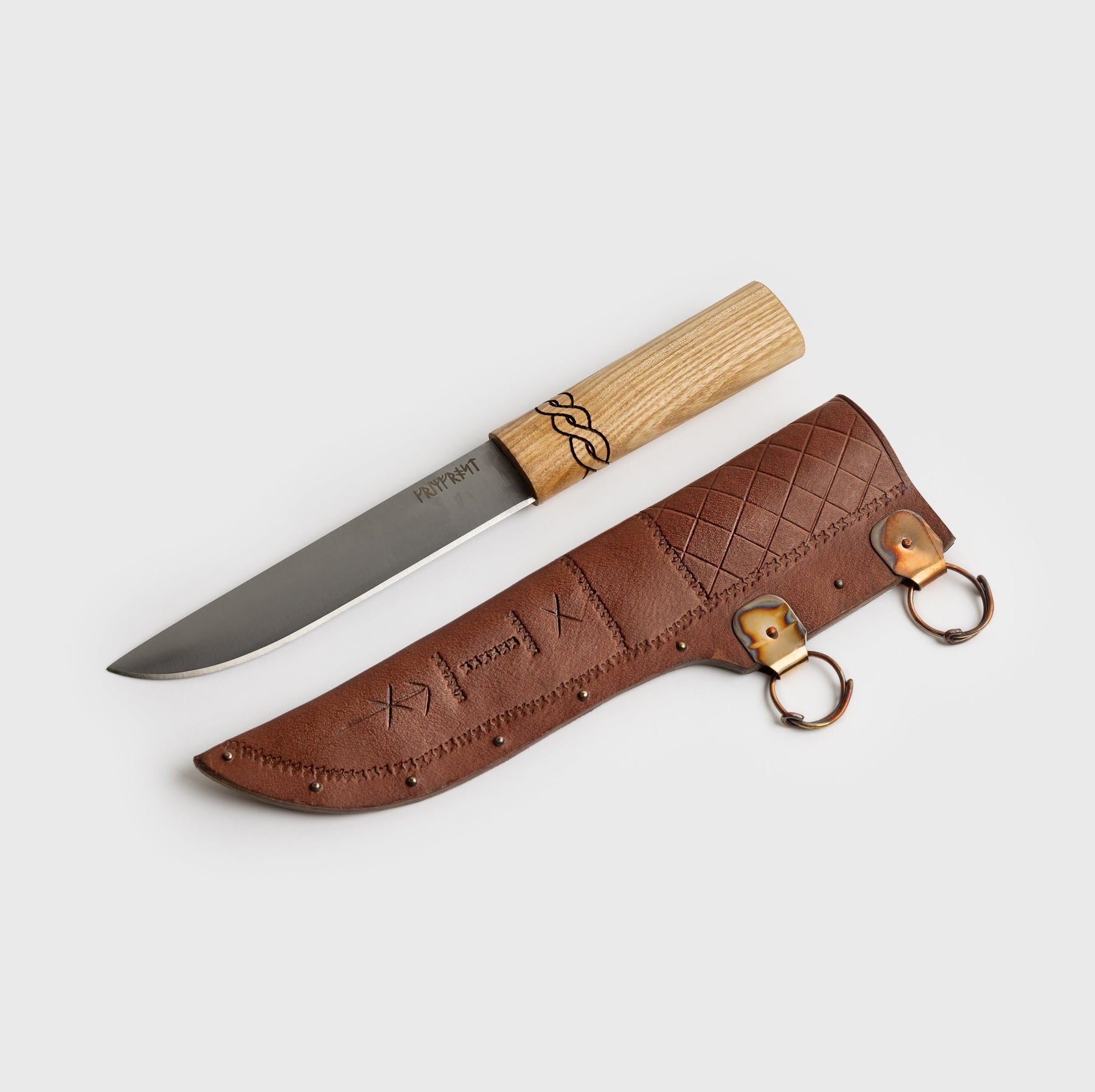 Small Seax with a decorated leather scabbard and a knotwork design on the ash handle. Comes with Grimfrost's runic logo on the blade.