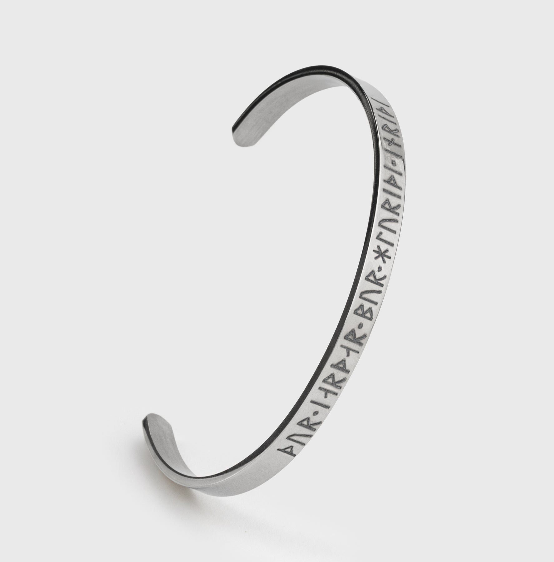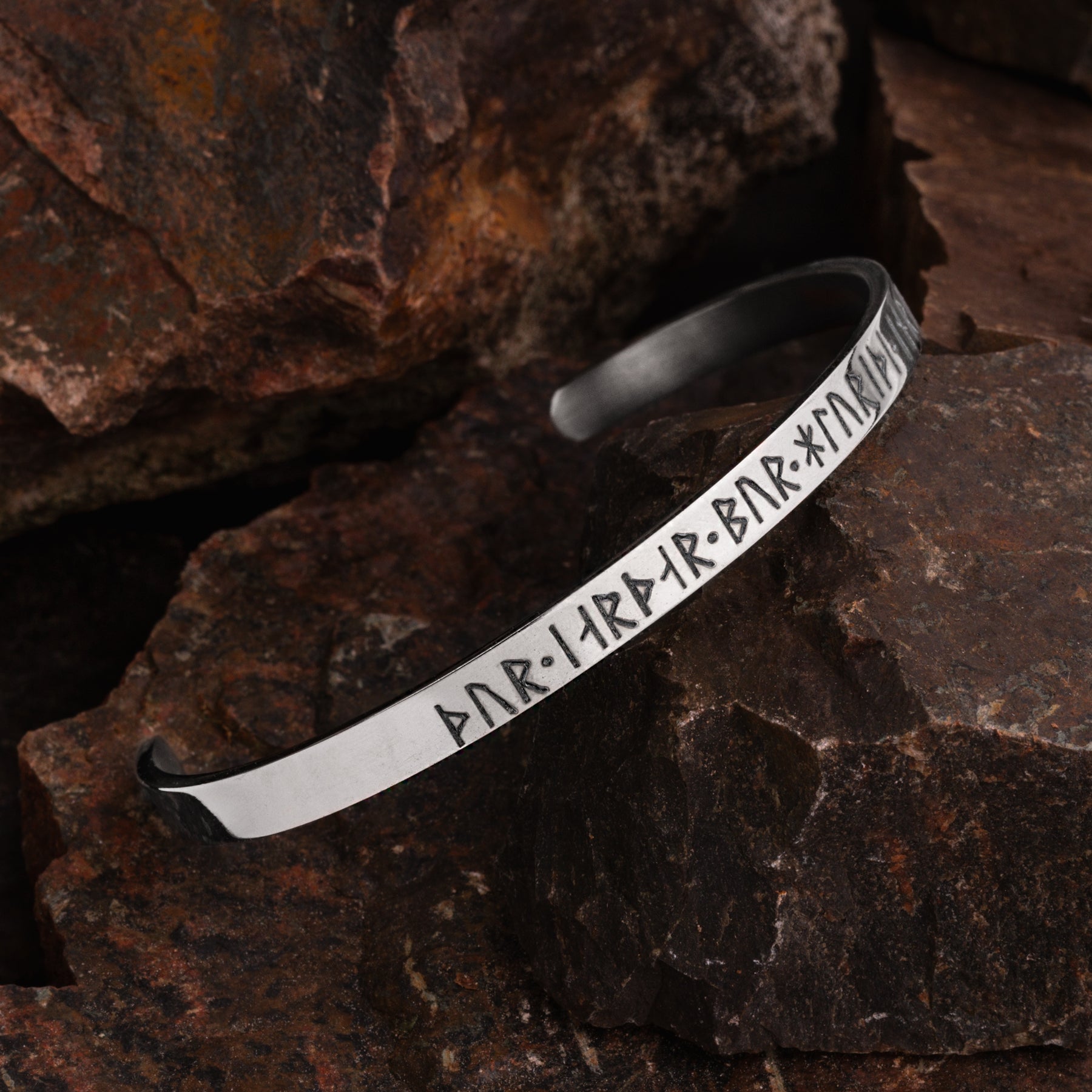 A classic, timeless bracelet for all occassions. Engraved on it with the Younger Futhark is: "Þorr jarðar burr hlórriði einriði", which translates to: "Thor, Earth's son, the Thundering Storm, He who travels alone." They are all different names used for Thor.