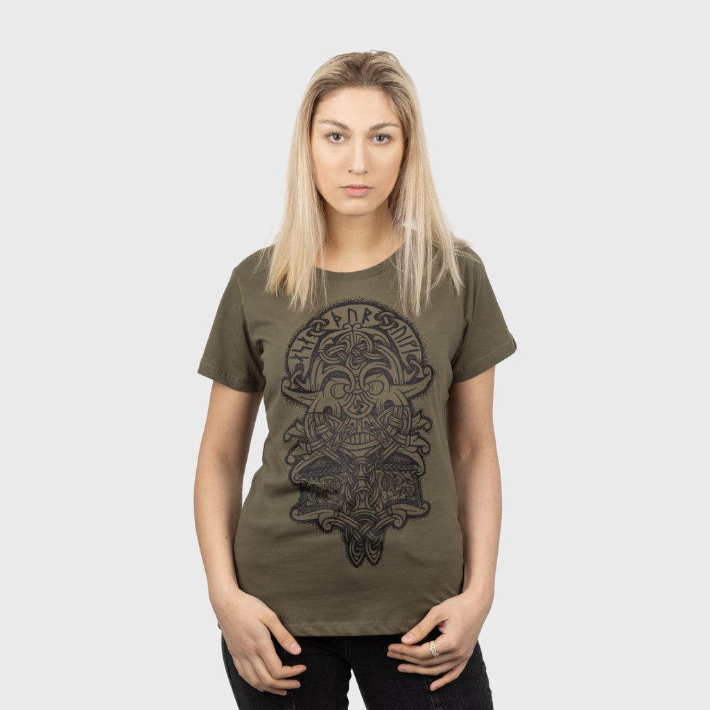 The shirt is printed with a Thor Mask, a stylized Mjolnir and "Asa Thor Viki" written in runes. It translates to "Thor the Aesir Bless/Protect".