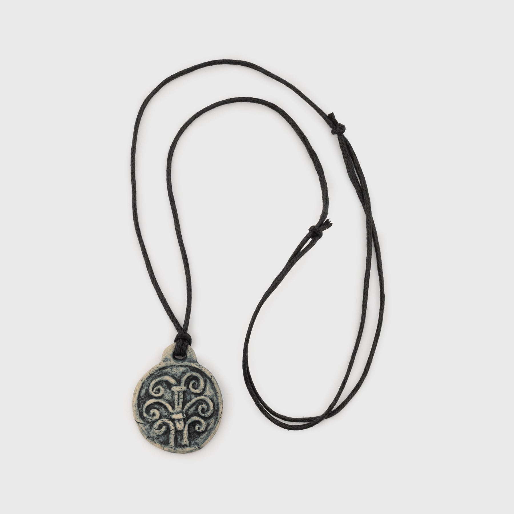 Handmade ceramic pendant inspired by an original find from Grave 967, Birka. The pendant features a circular shape with a motif reminiscent of Yggdrasil, the World Tree from Norse mythology, a common theme on artifacts from Viking Age Birka. Each pendant is individually crafted, giving it a unique color and texture. Comes with an adjustable cord.